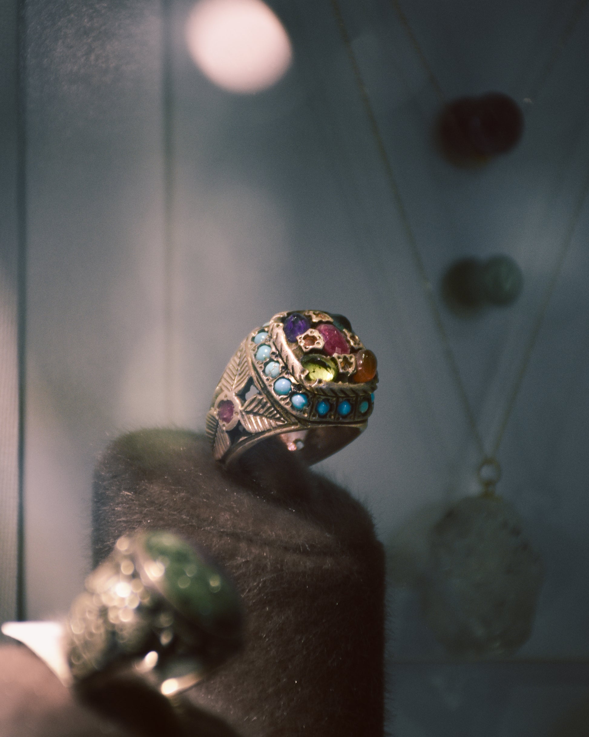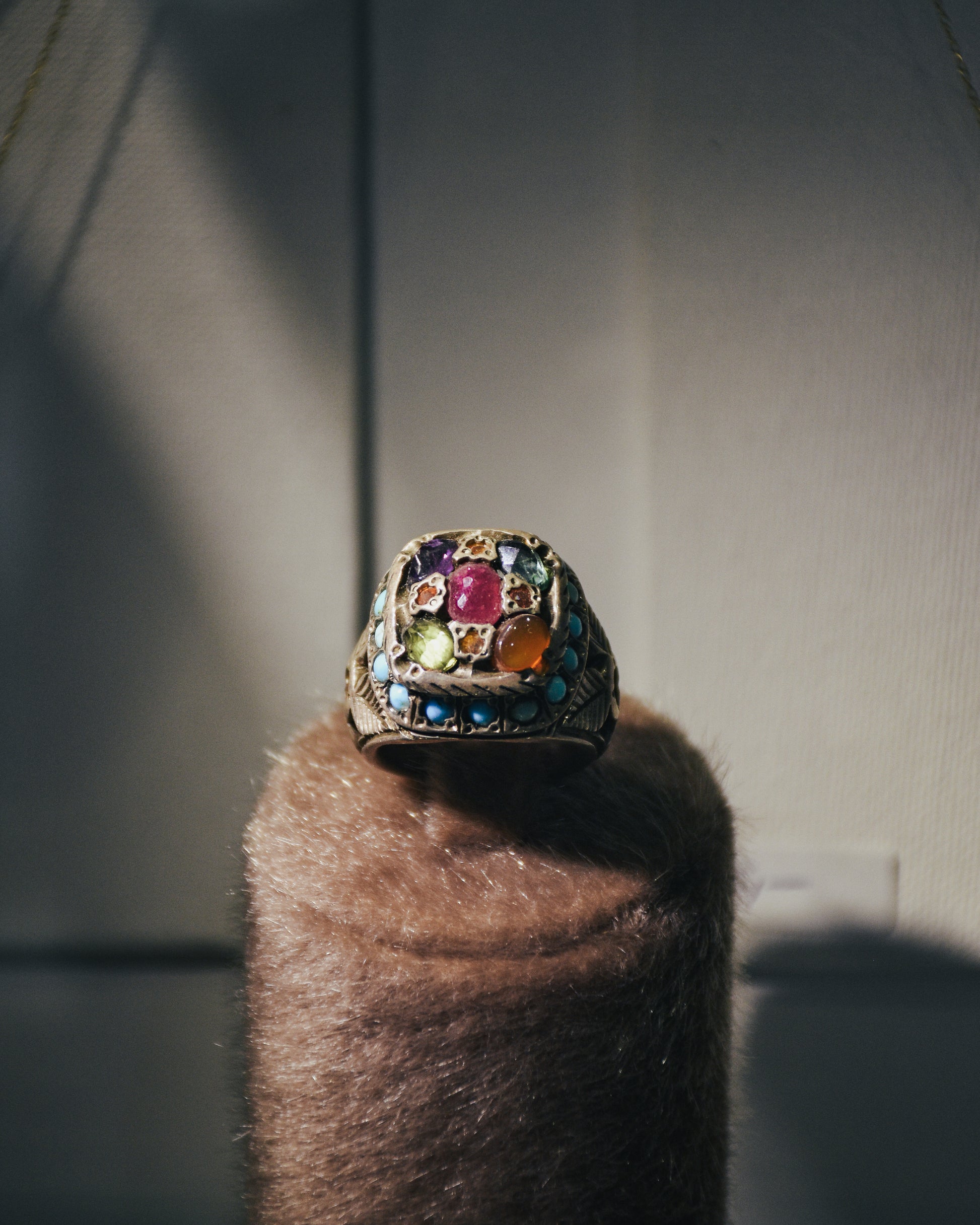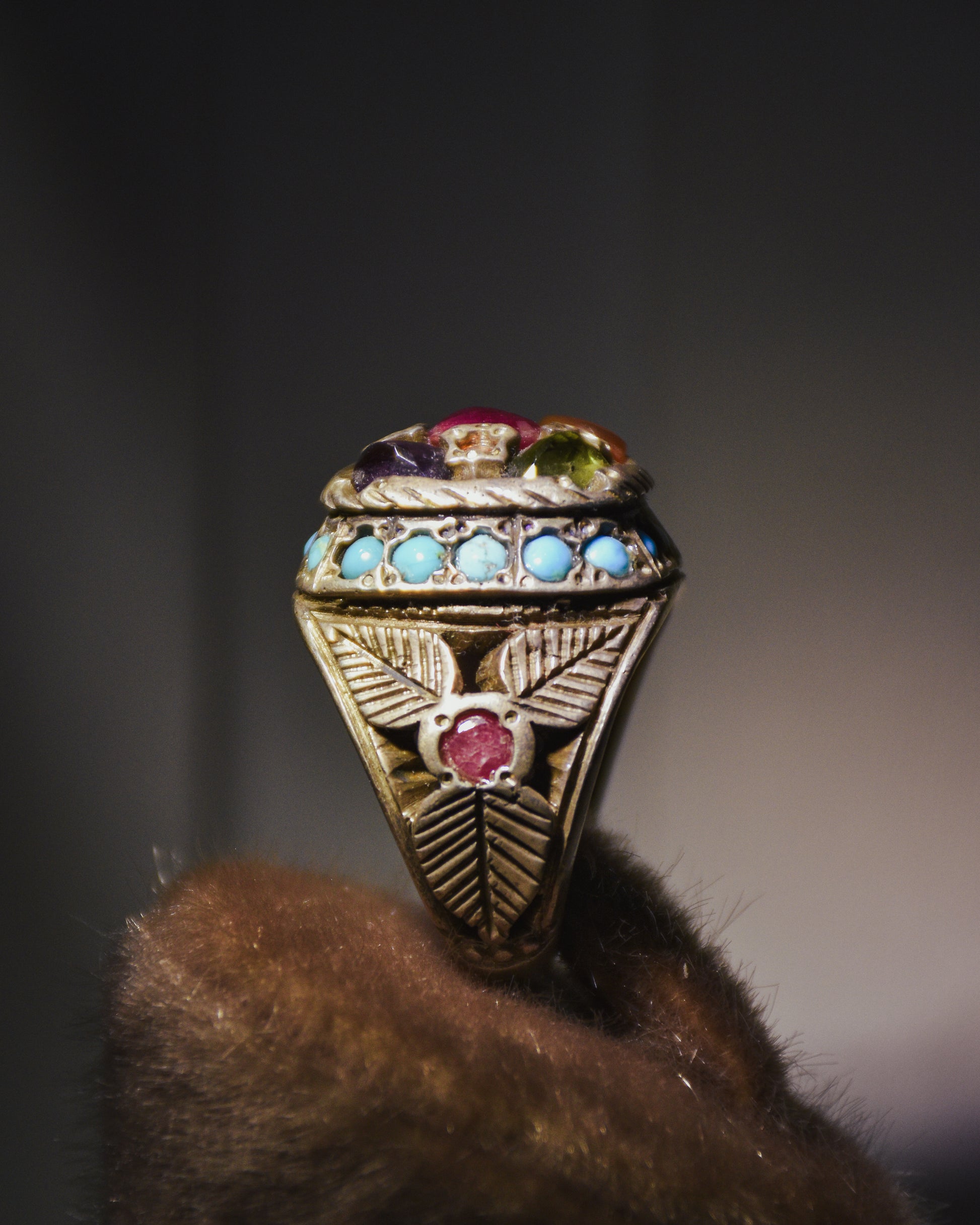 ئەلقەی زیو لە یاقوتی سوور و سەفایەر و ئەمەثێست و عەقیق و سترین و پیرۆزەوە، بە دەست دروست کراوە